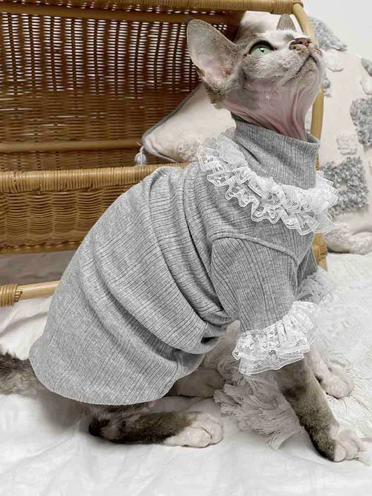 Sphinx German Hairless Cat Clothes Spring Summer Gray Mid-High Collar Cotton Elastic Lace Lace Bottoming Shirt