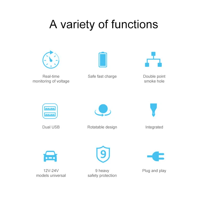 Built-in over-current, over-voltage, over-temperature, short-circuit, over-power and other multiple protection functions to ensure stable current output, protect your car and your equipment