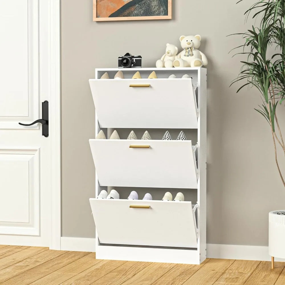 👡Spacious Storage Space: This shoe cabinet for entryway offers three flip drawers and a shelf on the top, giving you ample room to store shoes, and other items. The tipping shoe cabinet can hold up to 10 pairs of shoes (When the shoes are stacked up and down), If placed normally, 2 pairs of adult shoes and 1 pair of children's shoes can be placed on each rack.
